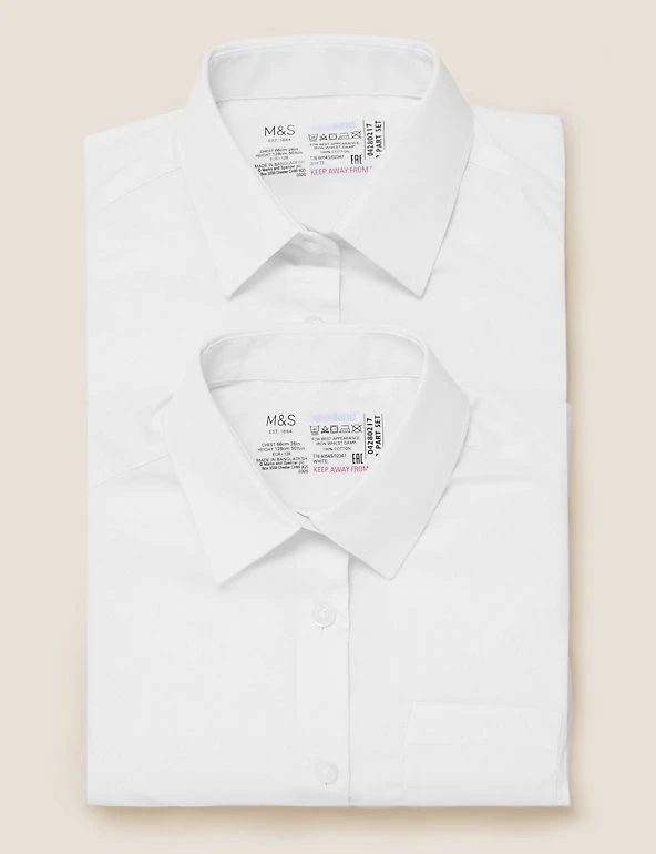 Designed especially for sensitive skin, this pack of pure cotton shirts has soft, flat seams and no internal labels. Long-sleeved style and for sizes below 8y they come with expandable elasticated cuffs and Easy Close rip tape behind top button to help kids dress independently. We only ever use responsibly sourced cotton for our clothes.