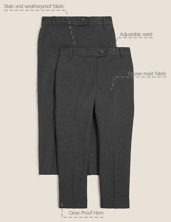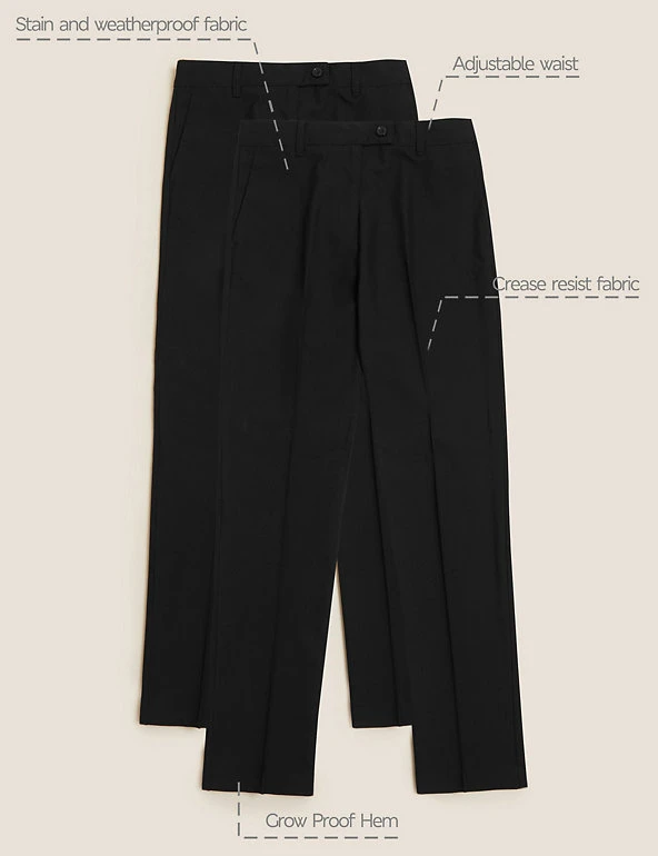 These school trousers come in a handy pack of two to see them through the week. Classic regular fit with a modern skinny leg. Grow-proof hems and an adjustable waist will help them fit all year long. Made from crease-resistant material that won’t crumple throughout the day. Stain & weatherproof technology provides a durable finish that helps stop stains from forming. Made with recycled polyester and sustainable viscose.