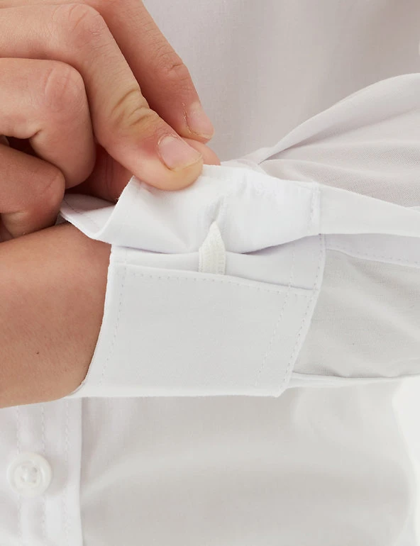 Our Adaptive shirts will make mornings that much more simple. They come with handy additions like hidden rip tape behind buttons and stretch cuffs for easier dressing and undressing. Our classic regular fit provides a smart and comfortable wear. Easy to iron fabric means it only takes a quick press for a crisp finish. Pack of three long sleeve shirts. We are transitioning the polyester in this garment to recycled polyester. While we transition, customers may receive items made with either sustainable sourced cotton and recycled polyester or just sustainable sourced cotton and polyester.