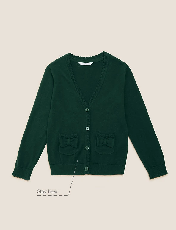 This children’s cardigan features pockets with a bow detail, adding a touch of style to an everyday essential item. Made using our cotton as well as our StayNEW™ technology which reduces bobbling and colour loss, keeping clothes looking newer and brighter for longer. We are transitioning this garment to organic cotton. While we transition, customers may receive items made with either sustainably sourced cotton or sustainably sourced organic cotton. We only ever use responsibly sourced cotton for our clothes.
