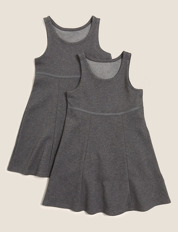 Add to kids’ everyday essentials with this pack of two cotton-rich pinafores. This sleeveless style layers easily over shirts or polos so they can wear it throughout the year. Complete with jersey panel detailing. Made with organic cotton. We only ever use responsibly sourced cotton for our clothes.