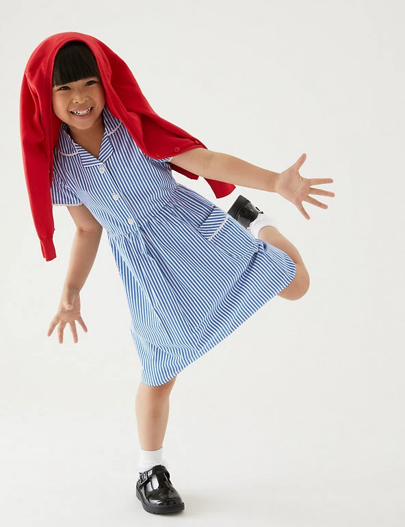 Our striped school dress has been designed with comfort and style in mind. A timeless regular fit with three-button fastening at the front. Short sleeves with two handy pockets. Our easy-to-iron finish means it just needs a quick press and it’s good to go.We only ever use responsibly sourced cotton for our clothes.