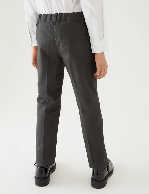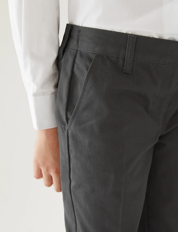 These school trousers are designed to make sure kids stay comfy all day. Made from soft, pure cotton in a classic fit with regular-cut legs. An adjustable waist and grow-proof hems will help them fit all year long. Specially designed for sensitive skin with flat seams and no rough labels or finishes. We only ever use responsibly sourced cotton for our clothes.
