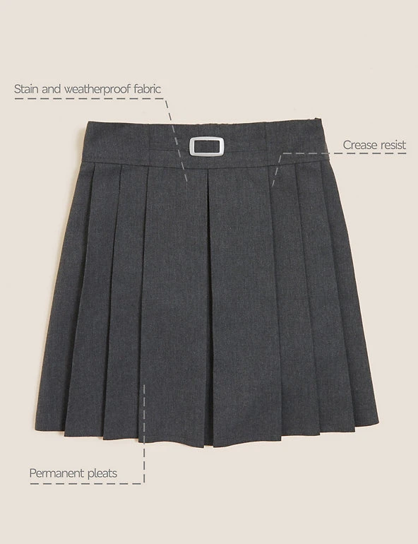 This children’s skirt features a metal buckle detail, adding a touch of style to an everyday essential item. Stain and Weatherproof finish repels water and stains and Crease Resistant material helps creases fall out easily. With Permanent Pleat technology to make sure pleats stay put wash after wash and an adjustable waist for perfect fit. Made with recycled polyester and sustainable viscose.